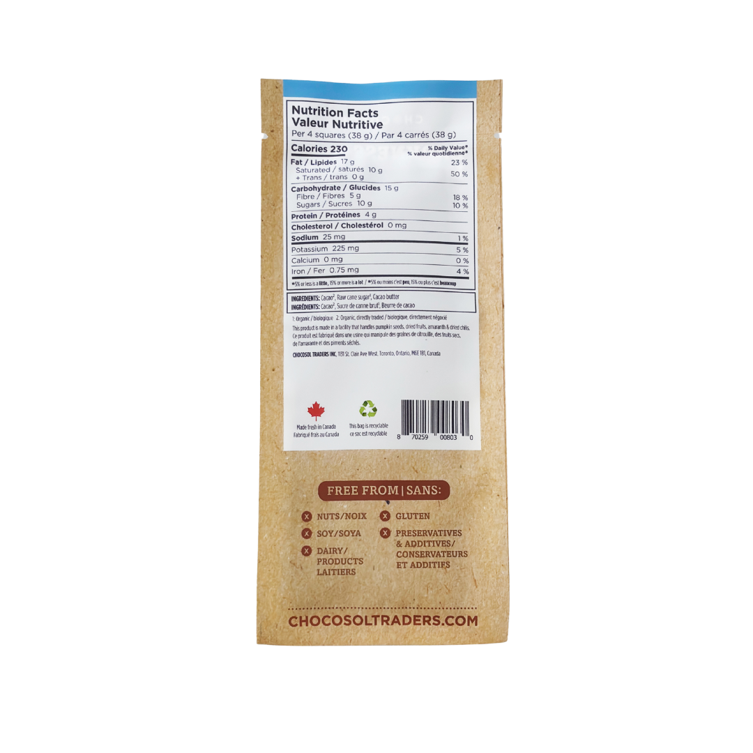 Ingredients: cacao, raw cane sugar, cacao butter.