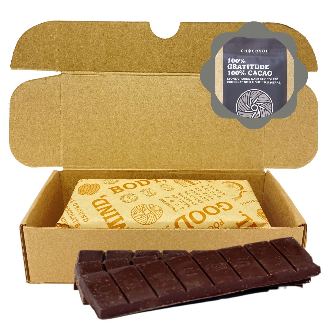 Our 100% Gratitude bar caters to the cacao purist. This chocolate is great for those avoiding all forms of sugar, those who simply prefer unsweetened chocolate in its richest form, and anyone looking for delicious baking and cooking chocolate.