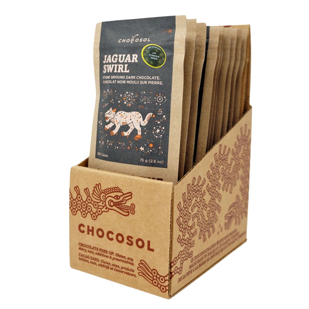 If you're familiar with our classic Jaguar Swirl chocolate, you already love this bar's perfect balance of dark chocolate familiarity and Jaguar chocolate's intriguing complexity. The new addition of pumpkin seeds into the grind introduces a new layer of flavour, with nutty undertones and an irresistibly smooth texture. Try it today to find out for yourself!