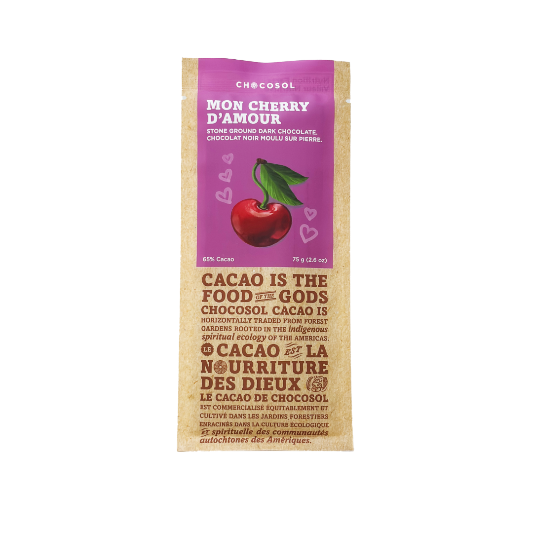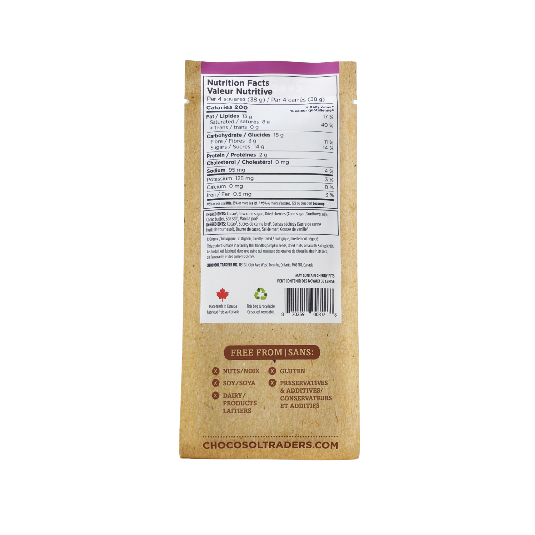 One of our most popular chocolate bars! Made with our crowd-favourite Vanilla Sea Salt 65% dark chocolate studded with bites of organic dried cherries.